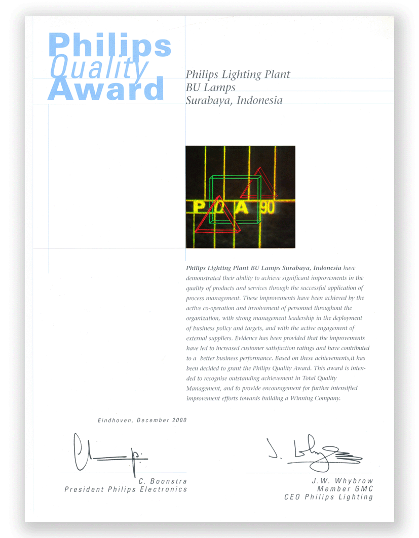 Bedrijfsonderdelen van Philips moesten aan de ISO 2002 normering gaan voldoen en als ze deze zware normering gehaald hadden ontvingen zij voor dit resultaat de PQA-Award.![]() | ![]() | |